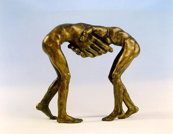 Der Künstler Michael Schwarze vertritt einen eigene Kunstrichtung, die es allgemein dem Betrachter nicht leicht macht, Zugang zu seiner Figurenwelt zu finden. Es ist jedoch auch für den ungeübten Betrachter eine Familienzusammengehörigkeit zu erkennen. Es ist eine immer wiederkehrende Leitfigur, man könnte auch sagen ein Stammvater, der sich hier fortzeugt kein idealer Vater, sondern von Anfang an behaftet mit dem Kainsmal durch die sinnbildhafte Reduktion der menschlichen Gestalt auf jene Gliedmaßen, die Handeln und Bewegung zum Ausdruck bringen. Fast immer tritt bei Michael Schwarze anstelle des Kopfes die rechte Hand. Bei den Frauengestalten allerdings fehlt diese Hand oder ist durch eine Schwinge ersetzt. Nur bei jenen Gestalten, die dem Tode ins Auge schauen wie der stürzende Ikarus oder bei dem toten Ekudu der Beweinung ist der Kopf vorhanden.