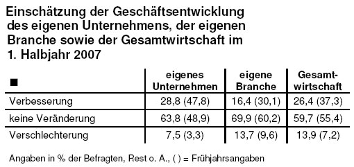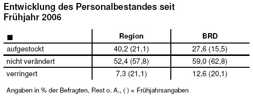 Die wirtschaftliche Lage des deutschen Mittelstands hat sich deutlich verbessert. Die in der letzten Befragung prognostizierte Entwicklung der deutschen Wirtschaft ist sogar noch übertroffen worden. Ca. 60 Prozent der regionalen Unternehmen bewerten ihre Geschäftslage als gut bis sehr gut. Damit hebt sich unsere Region stark von der bundesweiten Befragung ab, denn bundesweit schätzen nur ca. 43 Prozent der Befragten ihre Geschäftslage als gut bzw. sehr gut ein. Die regionalen Befragungsergebnisse sind deutlich besser als im Bundesdurchschnitt, somit profitiert unser Wirtschaftsraum offenbar besonders stark von der wirtschaftlichen Aufwärtsentwicklung. Die Entwicklung der Geschäftslage wird, wie in allen bisherigen Befragungen, im eigenen Unternehmen deutlich positiver eingeschätzt als in der eigenen Branche und der Gesamtwirtschaft. Die Geschäftslage hat sich in allen Kategorien abermals signifikant verbessert. Der Personalbestand der regionalen Unternehmen wurde in nicht unerheblichem Maß aufgestockt. Konkret gaben 40,2% der befragten Mittelständler an, Personal eingestellt zu haben. Im Frühjahr 06 lag die Zahl noch bei 21,1% so dass die positive Entwicklung markant ist. Die Zahl der zur Verfügung gestellten Ausbildungsplätze wurde nach den Unternehmensangaben nochmals geringfügig ausgebaut.Letzte Aktualisierung: 23.01.2007 Quelle: